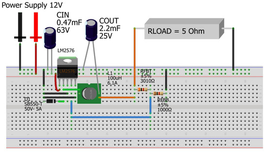 These components are listed in the Texas Instruments LM2576S-ADJEVM User’s Guide [39]. However, it is worthwhile to mention that the demonstration board includes particular electronic components—for example, decoupling capacitors—to minimize the noise at the output [35,36,40], which, although they are recommended, are not essential. Focused on the aim of having a quick prototype, only essential components (, , D, L, feedback network, and LM2576-ADJ) were included in the breadboard and stripboard implementations (Figure 4). Furthermore, the SMT components from the demonstration board were replaced by their twin components using through-hole technology, except for the coil. Wire terminals were soldered for this component to connect it to the breadboard. To improve the reproducibility of the results commented below, Table 2 gathers the manufacturer reference for the electronic components which were connected with the IC LM2576-ADJ (Figure 4).