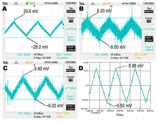 The quality of a voltage regulator is tightly linked to the voltage ripple at the output. The ripple can increase due to imperfections in the circuit’s and components’ physical implementation (ESR of output capacitors, parasite capacitors, unexpected defective contacts, etc.). For this experiment, the circuit shown in Figure 2 was implemented, and a load resistor equal to 5.04 (all resistors included in the study were measured under four-wire configuration) was set. A DC input voltage of 12 V from a DC power supply was connected at the input. Figure 5 shows the decoupled output voltage obtained for the breadboard (A), stripboard (B), demonstration board (C), and software simulation (D). The second column of Table 3 summarizes the numerical results related to the output voltage ripple. As can be deduced from the results, the maximum ripple for the simulated circuit was 11.8 , which represents the ideal response. At the same time, the demonstration board, stripboard, and breadboard achieved 19.0 , 17.2 , and 57.6 , respectively.
