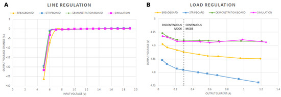 Figure 6A graphically shows the experimental results from the line regulation test. The tendency followed by the four configurations is very similar and can be divided into two sections. As long as the voltage drops below a breaking point close to 7 V, all the configurations perform poorly: small changes at the input are translated into significant changes at the output. Once the input voltage stays above this limit, all the configurations work significantly better, and the output voltage remains regulated regardless of the input voltage. For this reason, the numerical values of the line regulation (Table 3) have been computed considering a variation in the input voltage ranging from 8 V to 19 V. Under this consideration, if the breadboard implementation is considered, the output voltage varies by just 0.37%. It should be said that the aforementioned breaking point is not reached for all the configurations at the same input voltage. Those configurations with their components soldered performed very similarly to the simulation results. They entered into the regulated region for an input voltage close to 6.4 V, which represents 1.4 V above the output voltage (5 V). The last configuration to achieve the regulated region was the breadboard-based one. For this configuration, an input voltage of nearly 3 V above that of the output was needed to operate in the regulated area. According to the datasheet, that represents a value worse than expected (2 V above the output voltage should be enough to make the device work properly). The limitations of the breadboard lie behind this setback.