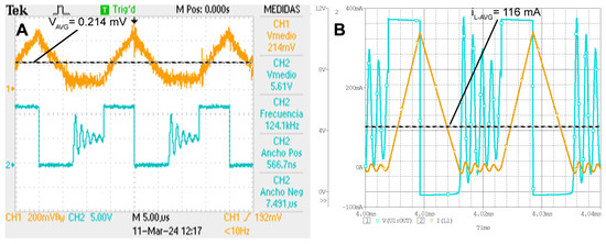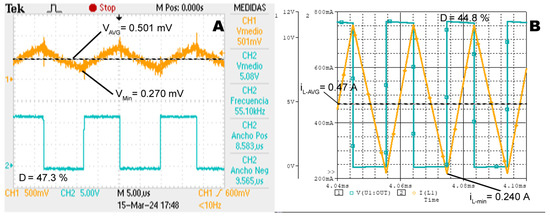 Results for the implementation mounted in the breadboard (A) and simulated circuit (B). The duty cycle (blue lines) and the current across the buck converter’s inductance (orange lines) work in continuous mode.