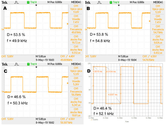 Figure 9 shows the experimental and simulated results for the duty cycle signal considering the buck converter implemented in the breadboard, stripboard, and demonstration board, and the one simulated with PSpiceTM (Figure 9A, Figure 9B, Figure 9C, and Figure 9D, respectively) when load resistance was 5.04 and the input voltage was 12 V. The sixth column of Table 3 summarizes the numerical results related to the duty cycle.