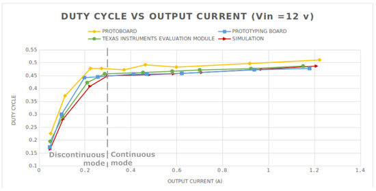 A calibrated shunt resistance of 0.1 was included in the series with the 100 H coil. Then, the scale of the oscilloscope was adjusted (factor 1/10) to have straightforward current readings from voltage ones (Figure 7A). The continuous and discontinuous modes were forced using the appropriate load resistors. According to the manufacturer, the output current demand triggers the continuous or discontinuous mode. The limit of 300 mA sets the boundary between the two regions. Output currents lower than this limit make the converter work in discontinuous mode; conversely, output demand higher than 300 mA forces the continuous mode. Thus, the experiment was carried out first with a load resistor of 10.22 while the input voltage remained constant at 12 V. Plots for and the duty cycle of the buck converter for breadboard and simulated circuit are included in Figure 7A and Figure 7B, respectively.