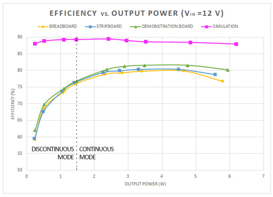 Maximum experimental efficiency values obtained for each implementation and simulation circuit are gathered in the 8th column of Table 3. The evolution of efficiency has been analyzed by employing the variation in the output power. Figure 11 shows how the efficiency changes for the four configurations under study when the output power varies from 0.2 W to a value close to 6 W. The experiment was conducted by fixing the input voltage at 12 V and modifying the load resistor from 4.07 to 101.49 . The dashed line highlights the division between the continuous and discontinuous modes, which is triggered for a load resistor of 16.7 .