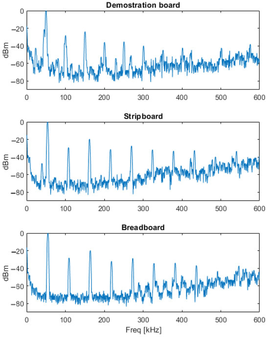 To evaluate the impact of conducted EMI, the Total Harmonic Distortion (THD) at the output of each studied circuit was obtained. A FS300 spectrum analyzer by Rhode-Schwarz (Munich, Germany) was used to measure the harmonics. Although this instrument is not part of the basic equipment suggested in Section 2.2, its bandwidth ranging from 9 kHz to 3 GHz allowed for the analysis of the signal up to its tenth harmonic. The power spectra of the output signal for each analyzed circuit are presented in Figure 12, normalized in amplitude with respect to the fundamental harmonic and in the frequency range from 0 to 600 kHz. Due to the bandwidth limitations of the spectrum analyzer, the attenuation at low frequencies were corrected using a first-order bandpass filter model.