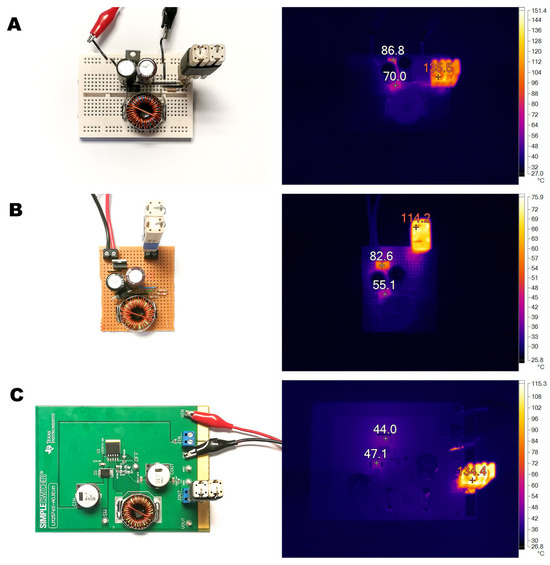 Figure 13 includes the visible and infrared spectrum for the demonstration board (Figure 13A), stripboard implementation (Figure 13B), and buck converter mounted on a breadboard (Figure 13C). A set of temperature measurements was performed using K-type thermocouples at different accessible points across the circuit boards. This provided reference data for the adjustment of the emissivity of the surface to obtain more accurate measurements using the thermal imaging camera TiS55 by Fluke (Everett, DC, USA). Temperature monitoring started at circuit power-up, but only readings registered after thermal equilibrium was reached—approximately five minutes into operation—were considered for the study.