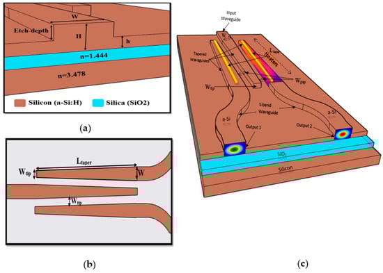 The wider end of each tapered waveguide (W) is 1.4 µm, while the tip width (Wtip) is anticipated to have the minimum feature size of the design, which yields to a shorter coupling length with higher efficiency [31]. The central tapered waveguide width slowly decreases from 1.4 µm to 0.5 µm in the direction of light propagation; two tapered waveguides are formed symmetrically for the output ports with reverse tapering, where width slowly increases from 0.5 µm to 1.4 µm in the direction of the light propagation. This type of tapered waveguide is used to increase the mode connection power transfer efficiency [MCTE] by changing the shape and size of the optical mode [32], which causes a coupling/splitting of power from the input waveguide to the output waveguides adiabatically.