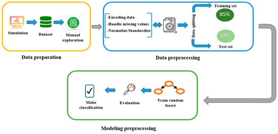 Generally, building an ML model passes through several steps, as depicted in Figure 2. After collecting the data, it is first essential to conduct a pre-processing operation to prepare the data and render them suitable for the ML model training. The first step is encoding the columns that have categorical values (polarization and single mode columns—see Table 1) to numerical values to be usable by the model function. Then, the imputation process is important to handle missing values and corrupted data. After that, data standardization is required at the same scale, an operation enhancing the model performance.