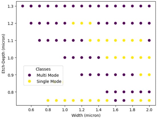 In the simulation process, W, H, and etch-depth were the three dimensions that were varied while recording the effective refractive index of rib and slab and the polarization of the propagated mode. Then, the SM was determined by comparing the effective index of the rib with that of the slab. If we found only one guided mode for each polarization, then we considered this waveguide as a SM waveguide and vice versa. In contrast, the waveguide was considered PI if the effective index was equivalent within an approximation of 10−3 for both polarization states, which made the fundamental TE and TM modes effectively propagate at the same velocity. To systematically identify the single-mode (SM) and polarization-independent (PI) conditions, we generated a comprehensive dataset of rib waveguide geometries through numerical simulations. In our dataset, a wide range of parameter values was considered to ensure comprehensive coverage of the design space. Specifically, both W and H ranged from 0.5 µm to 2 µm, with a step value of 0.1 µm, while the etch-depth range varied depending on the H value, while maintaining a minimum rib and slab thickness of 0.2 µm. This constraint was imposed to prevent the formation of fully planar or ridge waveguides, thereby preserving the intended waveguide geometry. The dataset consists of 3110 data points. A representative sample is presented in Table 1.