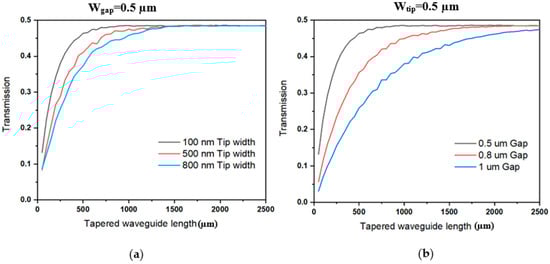 Transmitted power at one output of an adiabatic symmetric splitter, as the one shown in Figure 1, as a function of the tapered waveguide length (Lt) with: (a) 0.5 µm Wgap and tip widths (Wtip) of 100, 500, 800 nm. (b) 0.5 µm Wtip and gap values (Wgap) of 0.5, 0.8, 1.0 μm.