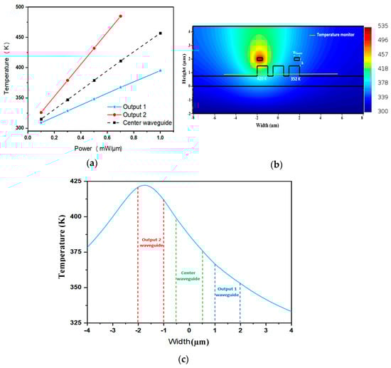 The lateral boundary conditions were considered isothermal while there is heat transfer by convection between air and the exposed SiO2 cladding surface on top. Figure 5a illustrates the temperature values recorded the three waveguides at half length of the tapered region (Ltaper/2), in a power dissipation range of practical interest applied to the Ti heater corresponding to Output 2. The temperature values were recorded at half the height of the waveguides (see the temperature monitor in Figure 5b). The results show that the waveguide temperature was linearly dependent on the power applied to the Ti wire. Moreover, it can be seen that, at high power, there were significantly different temperatures between the two lateral waveguides. For a power range of 0.5 mW/µm to 0.7 mW/µm, the temperature difference between the lateral waveguides varied between 70 K to 115 K. The low thermal conductivity of a-Si:H, its relatively high heat capacity, and also the low thermal conductivity of SiO2 were in fact leveraged to minimize heat spreading to the other regions of the device.