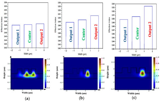 Effective index profile and electric field distribution of the propagated TE mode along the device width at half of the length of the tapered waveguides (Ltaper/2) for a dissipated power of (a) 0.1 mW/µm; (b) 0.5 mW/µm; and (c) 1.0 mW/µm.