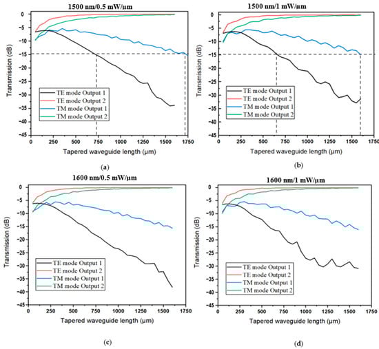 Transmission values at the output ports as a function of the tapered waveguides length (Ltaper) for both TE and TM modes: (a) at wavelength λ = 1500 nm and dissipated power of 0.5 mW/µm; (b) at wavelength λ = 1500 nm and dissipated power of 1 mW/µm; (c) at wavelength λ = 1600 nm and dissipated power of 0.5 mW/µm; and (d) at wavelength λ = 1600 nm and dissipated power of 1 mW/µm.