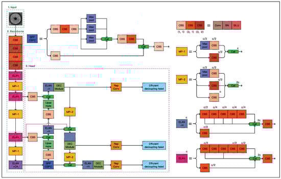 As a representative of the third generation of single-stage detectors, YOLOv7 [] achieves the optimization of detection accuracy and inference speed through a modular architecture. The network architecture adopts a four-stage cascaded design: The input preprocessing module optimizes zero-padding ratios through adaptive image scaling technology to enhance computational efficiency. The backbone integrates composite convolution blocks (CBS), efficient layer aggregation networks (ELAN), and max-pooling convolutional layers (MPConv) to construct a multi-scale feature pyramid with enhanced representational capacity. The neck implements an enhanced path aggregation network (PANet) for hierarchical feature fusion. The detection head employs re-parameterization techniques to achieve task-decoupled prediction while maintaining parameter efficiency. This systematic architecture ensures coordinated optimization across preprocessing, feature extraction, multi-scale fusion, and prediction subsystems, particularly effective for detecting micro-defects in high-resolution industrial images.