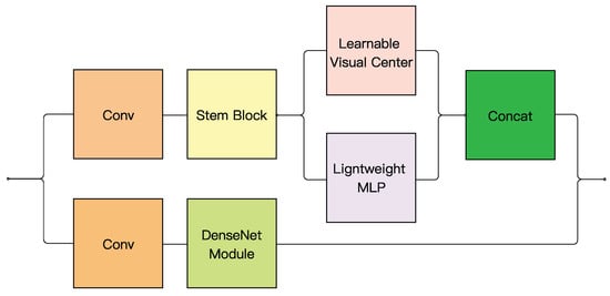 In the formula, X is the output of the EVC and denotes the feature map splicing along the channel dimension. and denote the output features of the lightweight MLP and LVC used respectively. is the output of the stem block, which is obtained from the following formula: