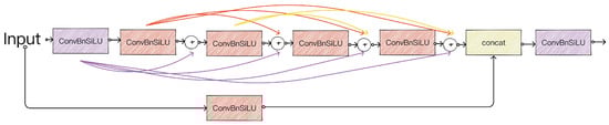 Given the tiny size of some of the defects present on the surface of the laser nozzles, there is a relative scarcity of their corresponding number of pixels. As the number of layers in the convolutional neural network increases, the convolution operation extracts and processes feature information more and more deeply. As a result, the features of defects with small sizes are easily ignored or lost, which makes it difficult to accurately capture such defects during the detection process, resulting in low detection accuracy. YOLOv7 fuses the structure of the FPN (feature pyramid network) and the PAN (path aggregation network) by constructing top-down and bottom-up paths combined with three different sizes of detection heads for output. This design enables the deep feature map to fuse both high-level and low-level semantic information, which, in turn, improves the detection accuracy of multi-scale targets. However, significant loss of low-level semantic information may occur during the up-sampling process, which adversely affects the recognition and localization of defects. In order to retain the critical low-level semantic information and achieve accurate localization of small-size defect locations, we borrowed the idea of BiFPN and introduced cross-layer connection. The exact structure is shown in Figure 1, and we denote this process with a thick red line. Specifically, we tensor splice the shallow feature maps in the backbone part with the deep feature maps in the PAN structure according to the size of the feature maps, so that the deep feature maps can fully incorporate the information of the shallow features. This improvement effectively incorporates low-level semantic information such as edges and contours into the PAN structure without significantly increasing the number of parameters, which not only enhances the model’s ability to recognize small-sized targets, but also improves the accuracy and stability of detection. By introducing a cross-layer connection strategy, our model significantly enhances the detection of small-size defects while preserving low-level semantic information. This provides an effective solution for the detection of surface defects on laser nozzles.