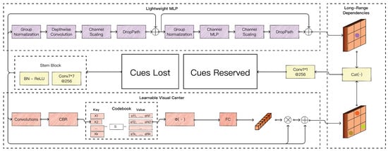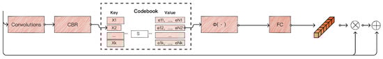 For the LVC module, its structural design includes a built-in codebook, structured as in Figure 6, which consists of a series of code words, each representing a feature prototype. In addition, the LVC module is equipped with a set of scaling factors, S, for adjusting the strength of the association between features and code words. The codebook in the LVC module consists of learnable feature prototypes, initialized randomly and optimized end-to-end during training. Each codeword is a trainable vector with the same dimension as the encoded features, evolving through backpropagation to represent distinct semantic patterns in the feature space. The scaling factors are also learnable parameters initialized via Xavier initialization, which adaptively adjust the association strength between encoded features and codewords. The codebook and scaling factors are integrated into the end-to-end training framework, updated via gradient descent along with other network parameters. This design allows the model to dynamically discover and emphasize critical local regions (e.g., corners or edges) without relying on pre-defined priors. For features originating from the stem module, they are first processed through a series of convolutional layers, a batch normalization layer, and a ReLU activation module for feature encoding. Subsequently, these encoded features are mapped into the inbuilt codebook. This process involves comparing and correlating the encoded features with each code word in the codebook, aiming to identify the code words in the codebook to which each local feature is most similar. In order to achieve an adjustment in the degree of association between the feature and the codebook code words, appropriate scaling factors are applied. These factors enhance or diminish the intensity of the features corresponding to a particular code word, thus allowing the model to focus more on key local areas in the image. Depending on the degree of match with the codebook and the adjustment of the scaling factors, the features are reintegrated and output. Ultimately, these features are combined with the lightweight MLP through the concat operation and channel adjustments to obtain the final output.
