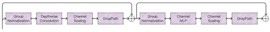 The lightweight MLP architecture contains two residual modules, a depthwise convolution layer and a channel MLP module, as illustrated in Figure 5. The depthwise convolution module groups the input features along the channel dimension and extracts spatial features using a 1 × 1 depthwise convolution layer (DConv). This design reduces computational overhead while maintaining feature representation capabilities. Subsequently, the features undergo channel scaling and DropPath regularization, followed by residual concatenation. The channel MLP module further processes the features by applying group normalization (GN) and channel-wise MLP (CMLP) operations. The above process can be summarized as: