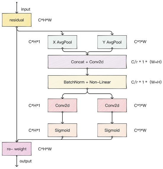 In the formula, represents the convolution operation, represents the ReLU activation function, and f denotes the intermediate feature mapping that encodes the spatial information in the horizontal and vertical directions. Afterwards, it is divided into two separate tensors along the spatial dimension to obtain two attention weight values by convolution and Sigmoid activation function. Finally, the weights are combined with the inputs to obtain an attention-enhanced feature map. The above process can be expressed as