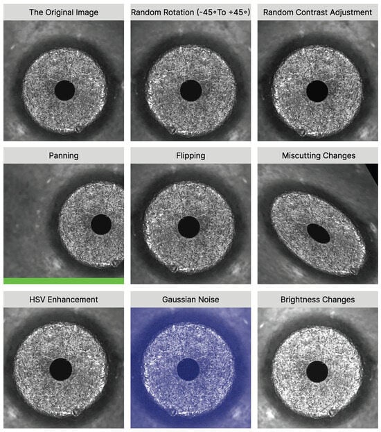 The original image and the image after random rotation (−45° to +45°), random contrast adjustment, panning, flipping, miscutting changes, HSV enhancement, Gaussian noise, and brightness changes, respectively.
