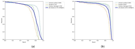 Furthermore, to validate the effectiveness and compatibility of the proposed improvement modules, we incrementally integrated the DEC module, cross-layer connections, efficient decoupled head, and coordinate attention into the baseline model. As shown in Table 3, the combined modules achieved superior performance across all metrics compared to individual module implementations. The final integrated DEC-YOLO model demonstrated a 10.5% improvement in mAP@0.5 over the baseline, representing the optimal outcome. Figure 11 compares the precision–recall (P-R) curves of DCE-YOLO and YOLOv7, further validating the synergistic enhancement from multi-module optimization.
