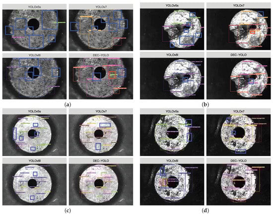 In order to visualize the superiority of this paper’s algorithm in the detection of defects on the surface of the laser nozzles, we visualize and analyze the detection effect of this paper’s algorithm on the surface of the nozzle. As can be seen from Figure 12, compared with the YOLOv8l, YOLOv7, and YOLOv5s algorithms, the improved DEC-YOLO algorithm is able to identify more defects, which significantly improves the confidence of the target identification, and especially detects more defects efficiently under the condition of low light, which proves its ability to adapt to the low-light environment. Although DEC-YOLO shows high accuracy in laser nozzle surface defect detection, some limitations still exist in practical applications. To gain a deeper understanding of the model’s performance boundaries, we systematically analyzed the error cases in the test set, which mainly include the following two types of problems. (1) Missed Detection of Small Defects: The model occasionally misses detection in images with low resolution or in scenes with very small defect sizes. For example, the blue box labels in Figure 12 demonstrate that multiple tiny defects are not detected. After analyzing, this kind of problem mainly stems from the insufficient resolution of the deep feature maps, resulting in the loss of spatial information of small targets. In addition, complex backgrounds (e.g., metallic reflections) may interfere with the focusing of the attention mechanism on tiny defects. (2) False Positives: Some of the false positives cases are caused by the similarity between the background texture and the defect morphology. Meanwhile, although coordinate attention suppresses some of the noise, the local attention weight allocation is still insufficient in highly reflective or complex texture regions. In Figure 12, we mark the misreported defects with red boxes, where multiple contour damages are misclassified as uneven surface. Another class of misreporting stems from the limitations of the data enhancement strategy, e.g., over-enhanced noise simulation may result in a model that is sensitive to high-frequency noise.