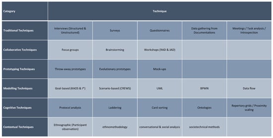 - Traditional techniques:As the name suggests, this category includes basic and traditional techniques that collect generic data. Generally, this category includes techniques such as interviews in both structured and unstructured forms, surveys, questionnaires, and data collection from existing documentation [11,15,16]. Some of the literature also includes other methods such as meetings, task analysis, and introspection. Introspection can be useful when there is a lack of answers and feedback; the requirements analyst may then need to imagine what kind of requirements are needed [9].