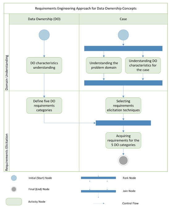 Therefore, in order to develop a viable data ownership concept, it is necessary to understand and analyze the requirements surrounding the case and the implementation of the concept. The RE approach provides a suitable outlet to achieve this objective. Although it was originally used as part of systems and software engineering developments, the RE process provides a perfect way to address data ownership concepts and their complexity. On the one hand, it starts with an initial understanding of the domain of the case under consideration. Conversely, it offers a range of requirements elicitation techniques that can be employed to extract pertinent data ownership requirements.