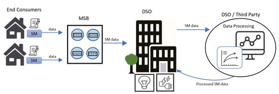 In Germany, a contractual agreement between the end consumer and a DSO (e.g., a public utility) allows the DSO to collect and process the consumer’s energy consumption data for the purpose of providing energy services. The data collected by the meter are transmitted to and stored by the MSB, which then forwards the data to the DSO. The DSO can subsequently process the meter data to support its operations or transfer them to a third party service provider, as illustrated in Figure 4.