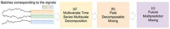 TimeMixer-FI(Feature Interaction) extends the original TimeMixer framework by incorporating the MLPMixer architecture to facilitate sophisticated feature interactions. Overview of the proposed framework as show in Figure 1. The process includes three main steps: (a) Multivariate Time Series Multiscale Decomposition, (b) Past Decompose Mixing, and (c) Future Multipredictor Mixing. On the left, batches corresponding to the signals are shown, with different colors representing distinct signals or channels. Arrows indicate the data flow through the three main steps, where step (a) decomposes the signals into multiscale components, step (b) mixes the decomposed components, and step (c) performs future prediction.