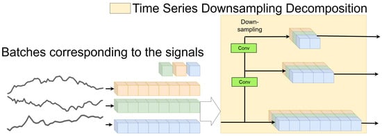 To disentangle complex variations, the past observations are first downsampled into M scales through average pooling, ultimately obtaining a set of multiscale time series , where , , and C denotes the variate number. The lowest-level series represents the input series containing the finest temporal variations, while the highest-level series captures macroscopic variations. Subsequently, these multiscale series are projected into deep features through the embedding layer, which can be formalized as . Through the above designs, multiscale representations of the input series are obtained. Illustration of the Time Series Downsampling Decomposition process as show in Figure 3. The input signals (batches on the left) are processed through multiple Conv and Downsampling layers to decompose the time series into multiscale components. Different colors represent distinct signals or channels, with the output components at varying scales shown on the right. Arrows indicate the data flow through the Conv and Downsampling layers, where each layer reduces the temporal resolution to capture multiscale patterns.