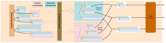 where Bottom-Up-Mixing(·) is linear and operates across temporal dimensions using GELU activations, with input dimension , and Feature Fusion(·) applies a LayerNorm followed by GELU. The structure of this module is shown in the Figure 4. Pink represents the trend component, blue represents the seasonal component, and orange indicates the decomposition process. The brown section on the right denotes the feed-forward process. Arrows (bottom-up in red and top-down in purple) denote the seasonal and trend mixing directions.