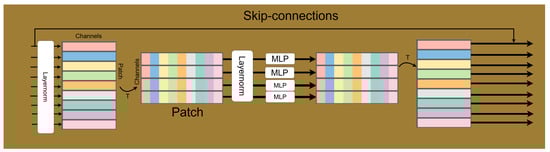 where represents the channel-processed feature. Through this Feature Fusion module, we can effectively integrate multi-scale features while preserving the original information through skip connections. The structure of the Future Fusion module (highlighted in brown in Figure 4) as show in Figure 5. The module processes input data through LayerNorm, Patch, and multiple MLP layers with skip-connections. Different colors represent distinct channels of the input data, which are processed and fused across layers. The ‘T’ denotes a transpose operation to adjust the dimensions of the data, and arrows indicate the data flow with skip-connections enabling information transfer across layers.