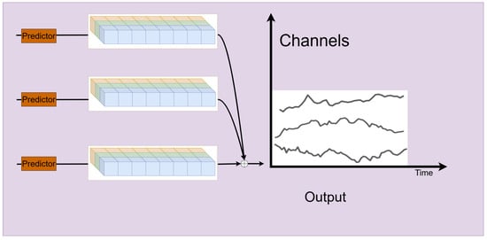 where represents the future prediction at scale m, and the final output represents the predicted future sequence. (·) refers to the predictor for the m-th scale sequence, which applies a linear layer to the final deepest feature representation from the previous layers, mapping it to the future sequence of length F. Notably, FMM aggregates multiple predictors, each utilizing the historical information from different scales. This aggregation enhances the predictive capabilities, especially in forecasting complex, multi-scale sequences. The structure of the Predictor module as show in Figure 6. The module processes multi-channel input data (represented by different colors) and generates the output time series. The vertical axis represents channels, and the horizontal axis represents time. Each predictor block processes a subset of channels to produce the final prediction. Arrows indicate the data flow from input to output through the Predictor blocks, and the output on the right shows the predicted time series for each channel.