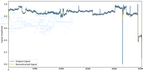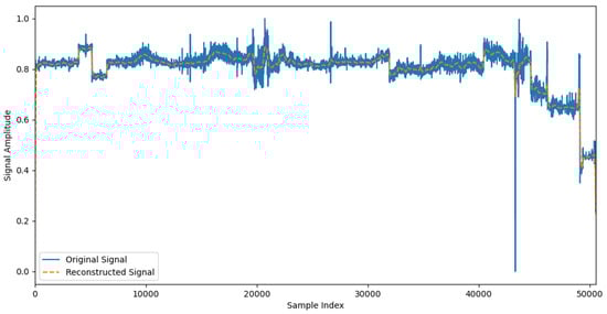 Figure 9 shows a comparison of the exhaust gas temperature signals from a six-cylinder engine, with the original signal above and the denoised signal below. The denoised signal is smoother, removes high-frequency noise, and retains the main features of the signal, which is conducive to subsequent fault diagnosis. Appropriate signal processing methods can effectively improve the quality of exhaust temperature signals and provide reliable data support for engine condition monitoring. Similarly, Figure 10 presents a comparison of the PS signal, with the original signal above and the denoised signal below.