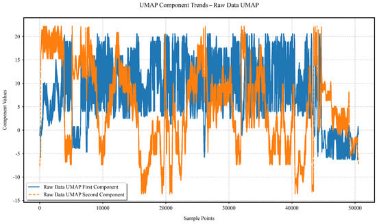 The selection of UMAP for dimensionality reduction in high-dimensional marine engine data is driven by its demonstrated superiority in handling nonlinear data structures, making it an optimal choice for fault detection in complex systems. Studies such as Altin and Cakir (2024) [16] have shown that UMAP enhances anomaly detection accuracy in multivariate time series datasets like MSL, SMAP, and SWaT, while significantly reducing training times by approximately 300–650%, owing to its ability to preserve both local and global structures. Similarly, research on structural health monitoring of damaged wind turbine blades underscores UMAP’s superior performance over PCA and t-SNE in feature extraction and classification of vibration signals, adeptly managing high-dimensional nonlinear data despite a modest increase in computational demand [17]. Furthermore, a recent study on dimensionality reduction in structural health monitoring reinforces these findings, demonstrating UMAP’s effectiveness in processing complex datasets under varied conditions, thus supporting its application in marine diesel engine fault detection, where nonlinear relationships and high dimensionality are prevalent [18].