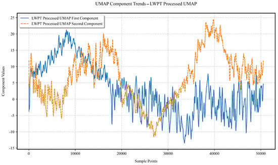 To evaluate the model’s behavior under real-world conditions with noisy data, we analyzed UMAP’s dimensionality reduction on raw, unprocessed signals (Figure 12). The resulting chaotic fluctuations suggest that without preprocessing, subtle fault signatures are obscured, reflecting challenges typical of noisy real-world scenarios. This is contrasted with the denoised results in Figure 13, where L-WPT preprocessing enhances pattern detection, demonstrating a practical workflow for real-world deployment. While this does not encompass all possible noise profiles, it provides an initial assessment of the model’s sensitivity to noise, with further real-world validation planned for future work.