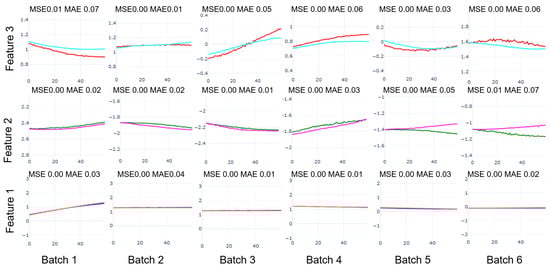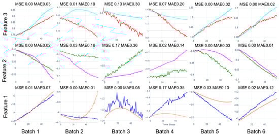 Analysis of Figure 18 examines the model’s predictive performance during steady-state operation across three feature dimensions: The red line represents the predicted values of Feature 1 (Pred F1), the green line represents Feature 2 (Pred F2), and the blue line represents Feature 3 (Pred F3). The x-axis denotes time steps (0 to 40), and the y-axis represents the feature values.The detailed subplot analysis reveals nuanced performance patterns across features and batches during steady-state operation. Feature 1 (Power Output) demonstrates exceptional stability, with gradual upward trends in Batches 1–4 (MSE: 0.00–0.01) and near-perfect prediction in Batches 5–6. The first UMAP component (Feature 2) exhibits consistent downward trends, with steeper declines in early batches (MSE ≤ 0.00, MAE ≤ 0.02) and gentler slopes in later ones (MAE: 0.03–0.07). The second UMAP component (Feature 3) shows more varied behavior, transitioning from stable downward trends in Batches 1–2 to upward movements in Batches 3–4, and controlled oscillations in Batches 5–6, while maintaining acceptable error ranges. This hierarchical error distribution, where Feature 1 achieves the highest accuracy followed by Features 2 and 3, validates the model’s capability to capture both direct performance metrics and UMAP-reduced representations during steady-state operation.