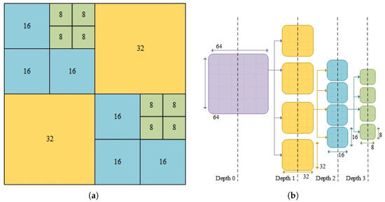(a) Quadaxial tree algorithm: CU cells are divided until the size is 8 × 8. (b) Depth map of the CU cells showing the division process.