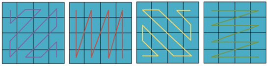 Building upon the generated geometry and texture maps, the occupancy map is introduced. In V-PCC, the occupancy graph is a binary map that represents the distribution of point cloud data in 3D space on a 2D plane. Defined with a precision of B × B blocks, the occupancy graph distinguishes between occupied and non-occupied areas of the point cloud data (where B is a defined parameter). For lossless coding, B is set to 1. Each B × B block is classified as full or empty based on a binary value that indicates whether it contains at least one non-empty pixel. During processing, each T × T block (Patch) is further subdivided into smaller B × B subblocks for more granular data management. The subblock traversal strategy involves the encoder selecting a specific order to traverse these B × B subblocks, with an explicit signal representing their index in the bitstream. This strategy enables the encoder to sort the binary values of the subblocks according to the selected traversal order and compress them using the stroke-length algorithm, thus optimizing the encoding process of the entire T × T block [21]. The subblock traversal is illustrated in Figure 4.