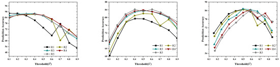 To attain the optimal encoding performance and the greatest prediction accuracy, the trained model is assessed by making use of the entire dataset. Specifically, the output of the CNN model—namely the confidence threshold for various CU sizes—is compared against the optimized threshold to ascertain the predicted partitioning for the entire CTU. The threshold is predetermined. Subsequently, the prediction accuracy is determined on the basis of this threshold. To find the optimal threshold, its value is varied from 0 to 1, and the average prediction accuracy is calculated at each step. This process is repeated for three different CU sizes, yielding the relationship between the threshold and prediction accuracy. As shown in the Figure 9, the model’s training accuracy fluctuates with the threshold, as different thresholds affect the model’s CU partitioning decisions, leading to prediction errors and impacting accuracy. Therefore, the choice of threshold is crucial.
