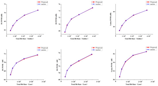 In the present study, the proposed approach is compared and evaluated against the benchmark method in TMC2v18.0 for V-PCC. The method proposed in this study demonstrates significant advantages in multiple aspects. First, an end-to-end optimization framework is employed, which enables the deep neural network to automatically learn motion and texture information from video sequences, thereby avoiding the complex manual design processes involved in traditional methods. Second, leveraging the nonlinear transformation capabilities of deep neural networks allows for the more efficient compression of video data. Finally, the adaptive motion modeling framework is capable of better handling complex motion scenarios, thus further enhancing encoding performance. The corresponding results are illustrated in Table 5 and Figure 11. As for the geometric graph, the average BD rates of the D1 and D2 components have risen by 0.42% and 0.56% respectively. Concerning the attribute graph, the average BD rates of the Luma, Cb, and Cr components show an increase of 0.18% for the Luma component and 0.68% for the Cb component, whereas the Cr component experiences a decrease of 1.04%. These results indicate that the proposed approach is efficient in evaluating the geometric and attribute graphs of the sequences.