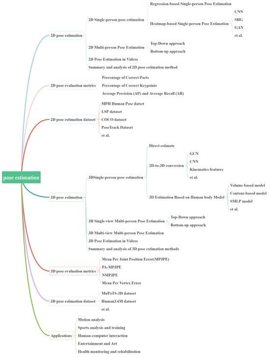 Early work in PE concentrates on 2D information, representing human actions and postures by detecting the 2D coordinates of human joints (e.g., head, shoulders, elbows, and knees) in images or video frames. The emergence of convolutional neural networks (CNNs), particularly after AlexNet’s groundbreaking performance in the ImageNet competition [11], propel PE forward. DeepPose [12] introduced the first deep neural network for end-to-end PE, employing a multi-stage regression approach to iteratively refine joint positions, initiating a surge of deep learning applications in the field. The development of multi-modal data has expanded PE into the 3D domain [13], where the objective is to reconstruct human joint positions in 3D space from 2D images or video. While 2D PE emphasizes accurate joint detection—robust to occlusions, multiple people, and complex backgrounds—3D PE confronts the additional challenge of recovering depth information to infer 3D poses, particularly in single-view or limited-label scenarios. Furthermore, 3D PE must address issues like depth blur, occlusions, and complex joint motions while balancing real-time processing requirements and model efficiency. This review provides a structured overview of these two dimensions, analyzing the advantages, limitations, and performance of various network architectures while providing a clear comparison of 2D and 3D PE approaches, highlighting their conceptual and technical differences. The framework of this review is presented in Figure 2.