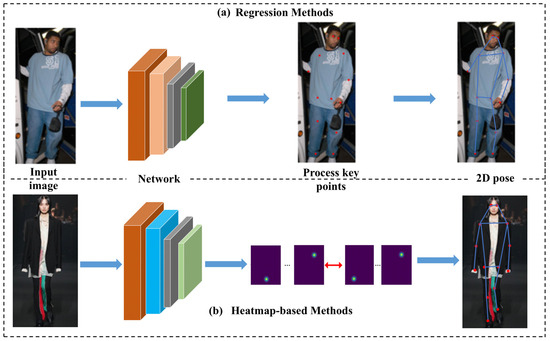 Two-dimensional single-person PE focuses on localizing human joints in images containing a single subject, as shown in Figure 3. In deep learning, Toshev et al. [12] introduce a cascaded structure based on deep neural networks (DNNs) that directly recovers keypoint locations from images. Despite employing the same network in the cascade structure, the model captures feature information progressively, layer by layer, marking a pioneering use of DNNs in PE. Figure 3 illustrates two core single-person PE methods: (a) regression-based and (b) heatmap-based approaches.