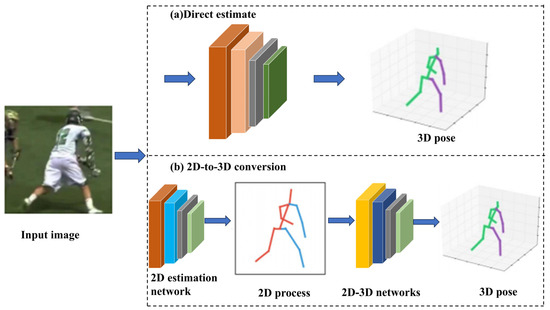The direct estimation approach entails feeding images directly into the network to produce 3D PE outputs, bypassing the generation of intermediate 2D information. This method, as illustrated in Figure 5a, offers a relatively straightforward solution. Early networks incorporated body part dependencies, combining pose regression with part detectors [70] to achieve end-to-end 3D estimation. For instance, in exploring 2D methods, Liang et al. [71] propose a structure-aware regression model based on skeletal structure loss, effectively addressing long-distance encoding and simplifying both 2D and 3D estimations. Luvizon et al. [72] employ a multi-task framework for 3D PE on static images, diverging from prior methods by directly predicting 3D data. Some studies introduced heatmap-based direct 3D predictions; for example, Nibali et al. [73] address the non-differentiability of 2D coordinates by proposing the MargiPose model, which generates continuous heatmaps to ensure differentiability while performing 3D predictions. Pavlakos et al. [74,75] reframe the highly nonlinear 3D coordinate regression problem using a discrete spatial representation of human anatomy. Their coarse-to-fine prediction framework within a convolutional network produced joint probabilities and used depth information to supply relative supervision, reducing dependency on precise 3D ground truth. While directly generating 3D information streamlines network architecture and avoids multi-cascade structures, its accuracy can be limited by the simplicity of the method. Consequently, recent research trends are shifting towards multi-stage fusion approaches to enhance estimation accuracy.