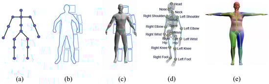 Commonly used human body models. (a) Skeletal point-based models; (b) contour-based models; (c) volume-based model; (d) hierarchical bone representation; (e) SMLP model.