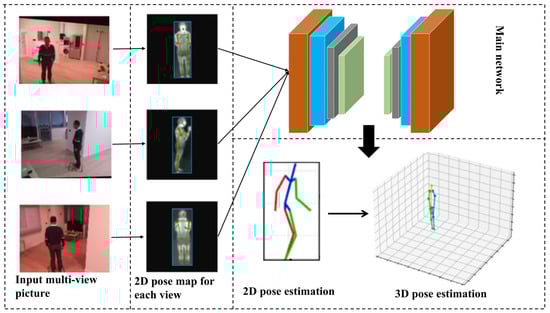 To address the occlusion challenge, hardware solutions can supplement the limited field of view in addition to depth information and other technical approaches. The most prevalent method involves estimating 3D human poses from multiple perspectives using multiple cameras or alternative sensors to capture the subject’s movements from diverse angles. The combined information from each perspective is then processed within a network, as illustrated in Figure 7, to enable accurate PE. However, this approach demands considerable computational resources and extended processing time, making it most suitable for multi-person PE where a balance between accuracy and efficiency is paramount. Helge et al. [140] propose combining camera poses with human poses, dynamically adjusting camera positioning to compensate for occlusions, and predicting consistency constraints through multi-view lenses. To mitigate annotation overhead and reduce redundancy during training, an encoder–decoder model [141] is introduced to extract geometry-aware 3D latent representations from multi-view images and segmented backgrounds. Notably, without periodic consistency constraints, individual view pairings may result in inaccurate 3D pose reconstructions [142]. To address this, additional motion information across views is incorporated by Tian et al. [143], enabling unified 3D reconstruction under multiple constraints. Likewise, paired annotations from thermal and visible images have been utilized for bounding boxes and PE [144], while an adversarial learning framework [145] derives multi-view correlations by measuring spatial distance and angular differences between 2D and 3D spaces. Considering the high cost of multi-view training, Wang et al. [146] introduce a static pose sample simplification approach to reduce storage costs and design a fast-start, lightweight network. Zhang et al. [147], recognizing the limitations of current multi-view methods in merging certain elements, propose a multi-view framework that leverages volume aggregation for multi-scale information integration. Their method further eliminates redundant background through grid-aligned voxel selection, ultimately predicting poses by fusing human body models with keypoints for enhanced accuracy and efficiency.