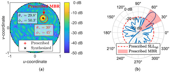 Most existing IFT-based algorithms, including but not limited to those in [35,36,37,38], prescribe a fixed main beam region (MBR) or a predefined mask for the radiation pattern. During synthesis, the sidelobe region (SLR) is depressed while the MBR remains unconstrained, allowing a beam to naturally form in the MBR with reduced SLL due to energy conservation. However, achieving the desired SLL requires multiple attempts with different MBR sizes. If the prescribed MBR is too small, the synthesis will fail to reach the target SLL (). Conversely, if the prescribed MBR is too large, the synthesized pattern may become defective or even invalid, as the lack of constraints within the MBR can result in unintended beam deformations. For example, as shown in Figure 1a, the synthesized beam deviates from the prescribed beam direction, and high sidelobes appear in the prescribed MBR, as shown in Figure 1b.