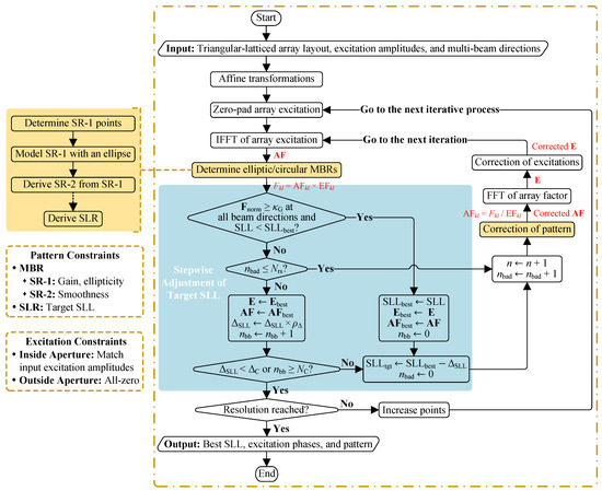 To address the adaptive synthesis of multiple elliptical beams into a pattern with the minimum SLL, two key enhancements are introduced in AIFT, as highlighted in the shaded steps of Figure 2: