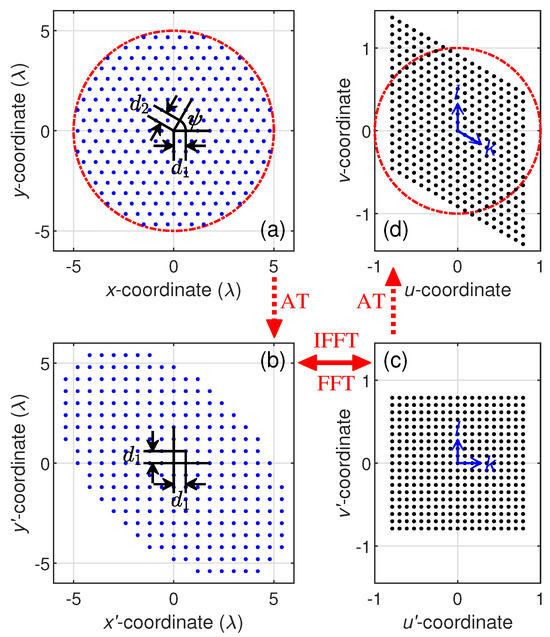 According to the affine theorem [45], the Fourier pair between triangular lattices x-y and u-v is affine-equivalent to that between the square lattices - and -. Therefore, the array factor of the triangular-latticed array can be derived by simply assigning new coordinates to every matrix element of , i.e., replacing and with u and v, which are calculated as follows (Figure 3d):