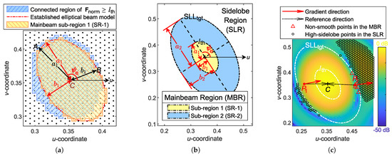 The parameter is introduced as a constraint to ensure beam smoothness. Since the final determined MBR is slightly larger than the actual one (to accommodate unpredictable beam tailing), sidelobes may appear in SR-2. Therefore, only points within SR-2 with are evaluated for smoothness, ensuring that the beam remains smooth and that any potential sidelobes in SR-2 do not exceed . For an idealized pencil beam, decreases in all directions from the beam center to the boundary of the MBR. That is, the gradient direction at every point on the beam (except the beam center) should point toward the beam center with a declination smaller than . A small , e.g., , can keep the beams smooth but limits the beam shape, resulting in an effect equivalent to using the circular beam model (20) and reducing the possibility of obtaining even lower SLLs. Therefore, is recommended to be between and to ensure smooth beams while preserving the maximum freedom for beam shapes. Take the pattern of Figure 4c as an example: and are two points in SR-2. The reference direction goes from (or ) to the beam center C. While the gradient direction of basically matches its reference direction, the gradient direction of deviates from its reference direction by more than , which means is not smooth at and needs to be corrected. For each non-smooth point, its correction value is determined by the elliptical beam model defined by (11). We can rewrite it here as follows: